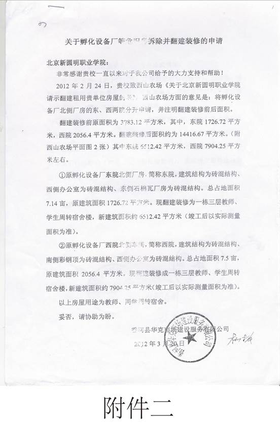 2012年3月22日学院回复“香河华克公司”杨某,务必得到有关部门批准后方可动工,不得违章。若违章建筑,产生的一切后果自行承担。(详见附件三)